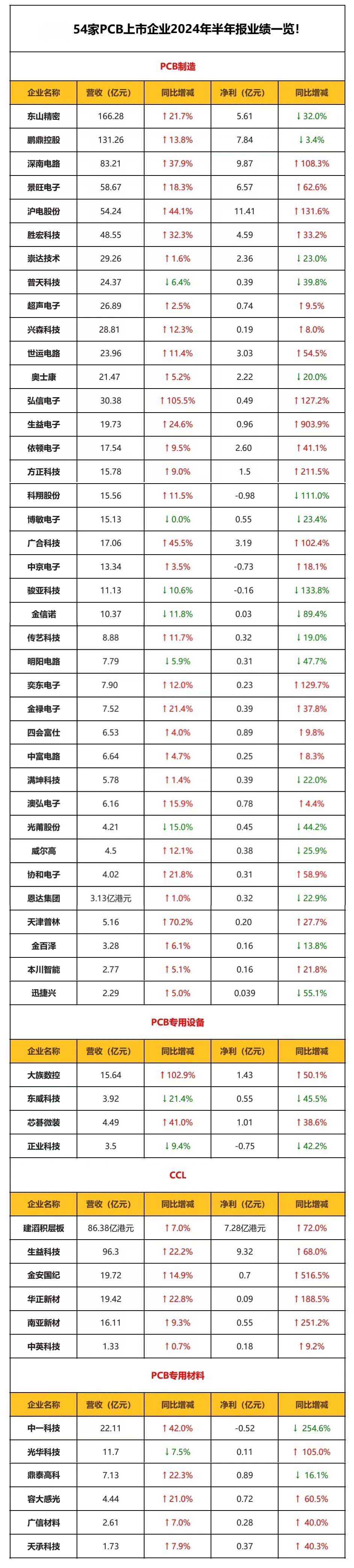 截至發(fā)稿,已有54家PCB披露了2024年半年報(bào),其中32家公司實(shí)現(xiàn)營(yíng)收、凈利潤(rùn)同比雙增長(zhǎng)。據(jù)【PCB信息網(wǎng)】不完全統(tǒng)計(jì),上半年?duì)I收及利潤(rùn)實(shí)現(xiàn)雙位數(shù)增長(zhǎng)的PCB行業(yè)上市企業(yè)有: